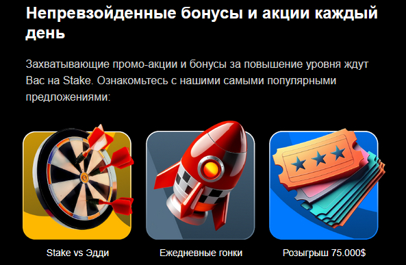 В Stake Casino проводятся многочисленные турниры и розыгрыши. Игроки могут принять участие в «Ежедневных гонках», общий призовой фонд в которых составляет сто тысяч долларов США.